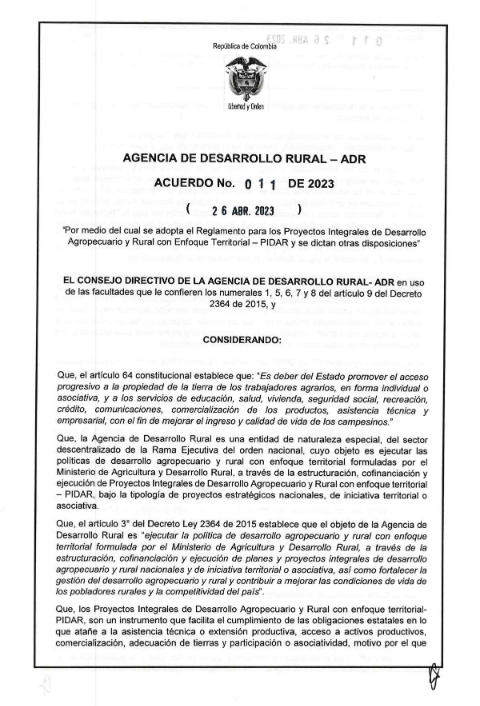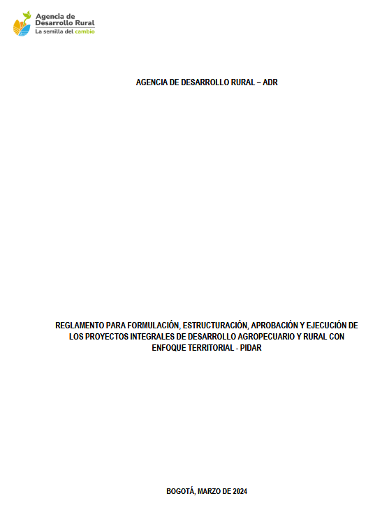 "REGLAMENTO PARA FORMULACIÓN, ESTRUCTURACIÓN, APROBACIÓN Y EJECUCIÓN DE LOS PROYECTOS INTEGRALES DE DESARROLLO AGROPECUARIO Y RURAL CON ENFOQUE TERRITORIAL - PIDAR"